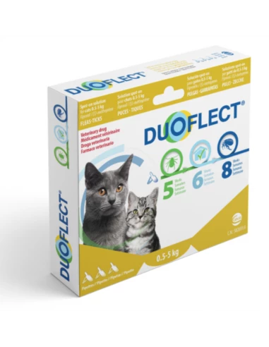 Duoflect Cat 0,5-5 Kg 3 pipette. Antiparassitario Per Gatti . Prevenire le infestazioni da pulci e zecche sul nostro gatto è davvero importante se si vuole salvaguardare la salute del nostro animale. Per questo motivo è consigliato applicare l’antiparassitario Duoflect Spot-on così da prevenire future infestazioni da parassiti e contemporaneamente eliminare quelli già presenti sulla cute del nostro gatto. Duoflect Spot-On è un trattamento antiparassitario indicato per gatti con un peso compreso tra 1-5 kg. Grazie al suo utilizzo sarà possibile prevenire future infestazioni da pulci e zecche. Il prodotto può essere usato come parte di una strategia di trattamento per il controllo della dermatite da allergia da pulci. L’antiparassitario Duoflect è realizzato con Fipronill una delle molecole più usate nel trattamento delle infestazioni da pulci e zecche. La sua formulazione garantisce un’immediata efficacia insetticida contro nuove infestazioni da pulci adulte fino ad un massimo di 9 settimane, mentre svolge una prevenzione contro le uova delle pulci fino a 8 settimane. Fipronil: svolge un’azione insetticida e acaricida su pulci e zecche. (S)-methoprene: che svolge un’azione ovicida e larvicida. . Avvertenze e ControindicazioniNon utilizzare nei gatti di età inferiore ai due mesi e/o con peso inferiore ad 1 kg. Non utilizzare in animali malati (per esempio, malattie sistemiche, febbrea…) o convalescenti. Non usare nei conigli, poichè possono manifestarsi reazioni avverse ed anche la morte. Non usare in caso di ipersensibilità al principio attivo, al dimetilsolfossido o ad uno qualsiasi degli eccipienti. Solo per uso esterno. Tenere fuori dalla portata dei bambini. Evitare il contatto con gli occhi. Evitare di bagnare eccessivamente il pelo con il prodotto, dal momento che poi assumerebbe un aspetto colloso nel punto del trattamento. Si possono verificare effetti estetici transitori come aspetto arruffato del pelo, aspetto untuoso, accumuli o lieve desquamazione al sito di applicazione