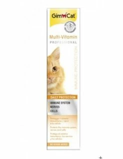 Gimcat Pasta Multi-Vitamin Professional , Protegge il sistema immunitario, i nervi e le cellule. Un sistema immunitario forte è il presupposto per una vita da gatto lunga e in salute. In situazioni di sovraccarico, diventa necessario un maggior apporto di vitamine e minerali, rispetto alla quantità assunta quotidianamente tramite l’alimentazione. È quindi fortemente consigliata un’integrazione. La pasta Multi-Vitamin Professional di GimCat con la sua Immun Protection Formula contiene: Ingredienti altamente efficaci quali le 12 vitamine essenziali, olio di lino di alta qualità e beta-glucano rafforzano il sistema immunitario e aiutano a costruire una protezione affidabile contro le influenze esterne. L’olio di lino contiene acido linoleico, che costituisce la base per gli acidi grassi DHA e EPA. Questi sono importanti per la produzione cellulare e per il tessuto nervoso.