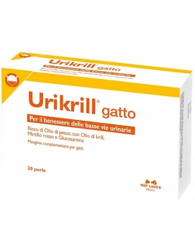 Urikrill gatto è indicato come trattamento nutraceutico in caso di: – patologie delle basse vie urinarie del gatto, a prevalente componente infiammatoria. – cistite idiopatica felina, in quanto riesce a ridurre drasticamente le recidive e a controllare la sintomatologia, particolarmente dolorosa per lanimale. – prevenzione, soprattutto nei gatti anziani, dove il trattamento farmacologico non è sempre possibile. COMPOSIZIONE:Composizione: Olio di pesce, Olio di krill, Prodotti ottenuti dalla trasformazione di erbe (Arctostaphylos uva-ursi L. Sprengel, Laspedeza Capitata Mich., Orthosiphon Stamineus Bent.), Residuo della spremitura di frutta essiccato (Vaccinium Macrocarpon Aiton 9,55%), Glucosamina Solfato (7,96%), Gelatina (bovino), Glicerolo, Sorbitolo. ISTRUZIONI PER UN USO CORRETTO:Modalità d’uso: Urikrill gatto va somministrato direttamente in bocca oppure aggiunto al normale cibo, tutti i giorni, per un periodo di almeno 30 giorni in ragione di: 1 perla al dì fino a 6 kg p.v. 2 perle al dì oltre i 6 kg p.v.