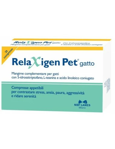 Nbf lanes relaxigen pet gatto 20 compresse per contrastare stress, ansia, paura, aggressività e ridare serenità.MANGIME COMPLEMENTARE COMPOSIZIONE:Principi attivi:Acido Linoleico coniugato, Qrill pet, Lactobacillus reuteri NBF 2*, L-teanina, 5-idrossitriptofano, FOS, Acido Butirrico. (*)inattivato termicamente. ISTRUZIONI PER UN USO CORRETTO:Istruzioni per l’uso:GATTI: ½ compressa al giorno fino a 6 kg di peso dellanimale e 1 compressa al giorno oltre i 6 kg di peso dellanimale.Per un uso a breve termine, iniziare la somministrazione al- meno 2 giorni prima dellevento previsto o delle variazioni ambientali. È necessario somministrare la quantità giornaliera raccomandata per tutta la durata dellevento che disturba lanimale.